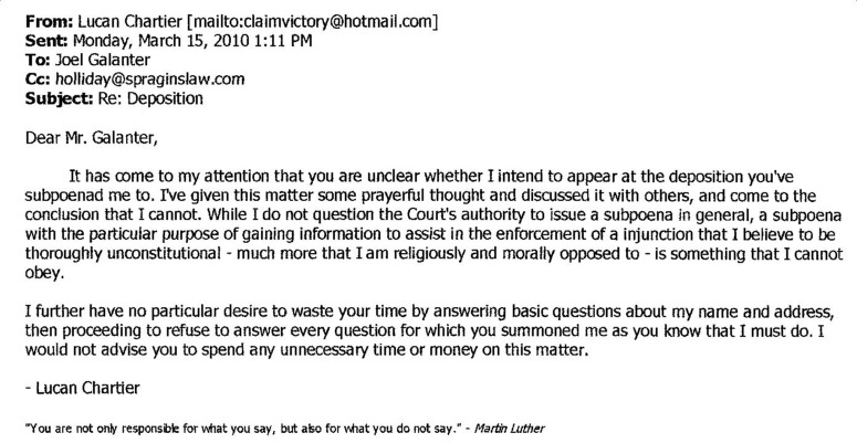 As I stated in my first letter to Mr. Galanter, my first reaction to the subpoena was to fight it by every legal means possible, be it technicality or otherwise. Yet I was cautioned against this both by my brethren and my Father upon earnest prayer. When I realized what I was to do was simply to be as a lamb to the slaughter, allowing them to do with me as they wish in response to my refusal to assist them, my first inclination was likewise to appear at the deposition to be in compliance with the Court inasmuch as I could.