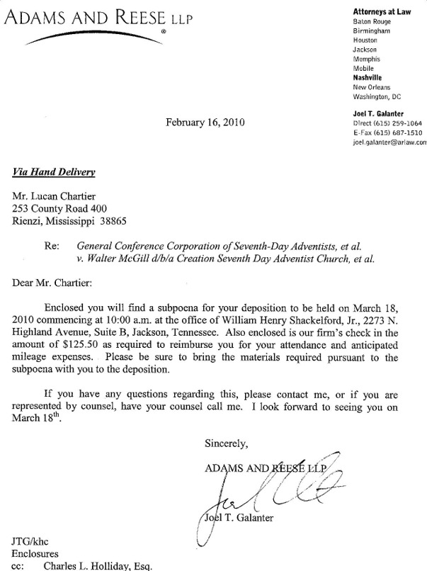 *No reply was received to the previous letter. On March 12th, Lucan learned that Mr. Galanter had asked Mr. Holliday, Pastor McGill's attorney, if he knew whether Lucan intended to appear at the deposition.