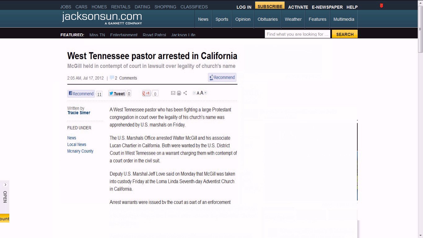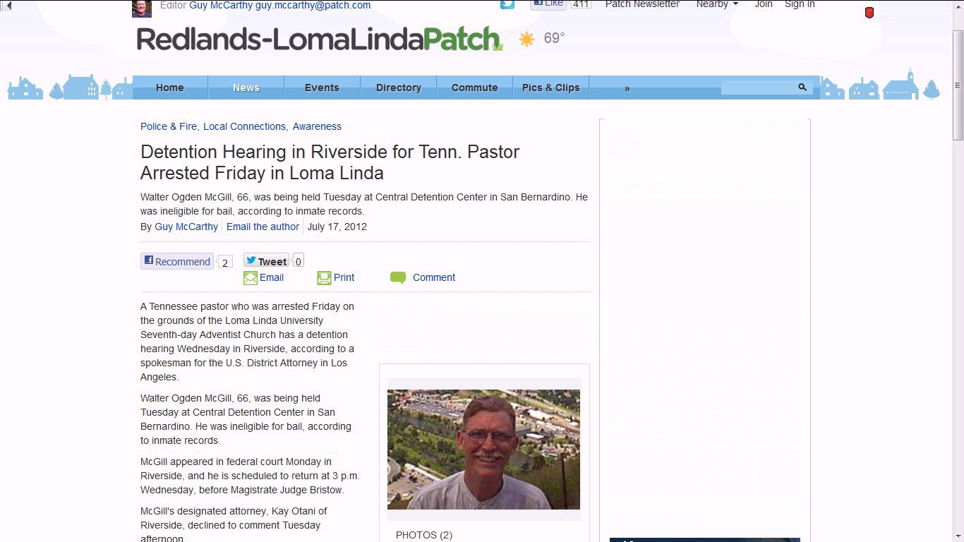 Two days before the July 15th press conference, at which point he intended to turn himself in, McGill was arrested on the Loma Linda University campus. This marks the first time since 1989 that an Adventist has been arrested for trademark infringement of the name "Seventh-day Adventist." McGill has vowed to fast from solid foods during the period of his incarceration.