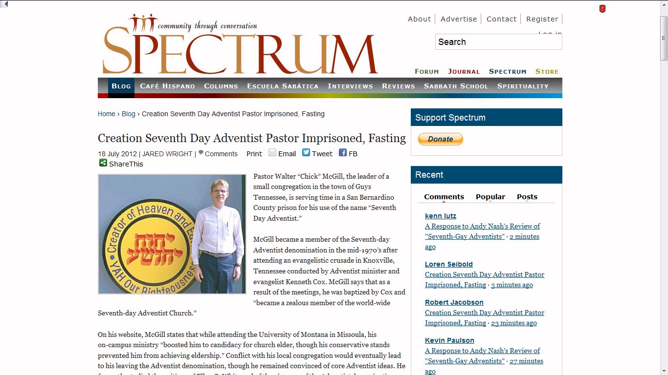 (Screen-shot of the Spectrum Blog)The second Adventist journal to report the controversy between Pastor McGill and the General Conference Church