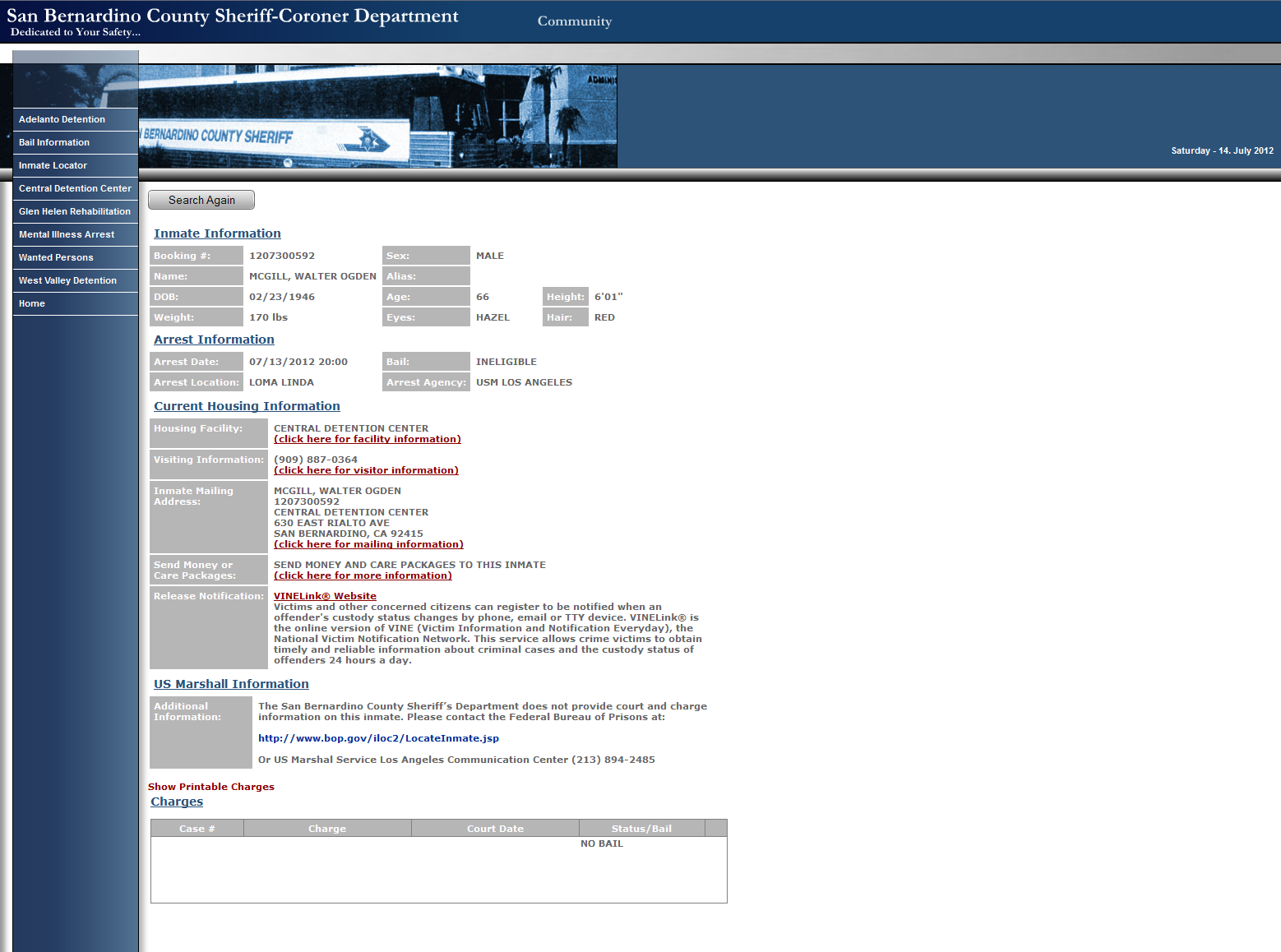 July 13, 2012 McGill arrested in California just prior to a planned news conference at which he intended to turn himself in. Currently held in San Bernadino Detention Center.