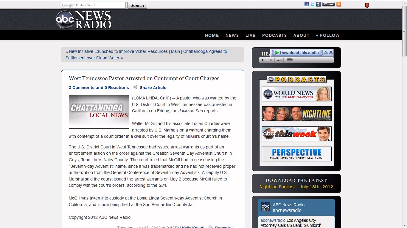 Two days before the July 15th press conference, at which point he intended to turn himself in, McGill was arrested on the Loma Linda University campus. This marks the first time since 1989 that an Adventist has been arrested for trademark infringement of the name "Seventh-day Adventist." McGill has vowed to fast from solid foods during the period of his incarceration.