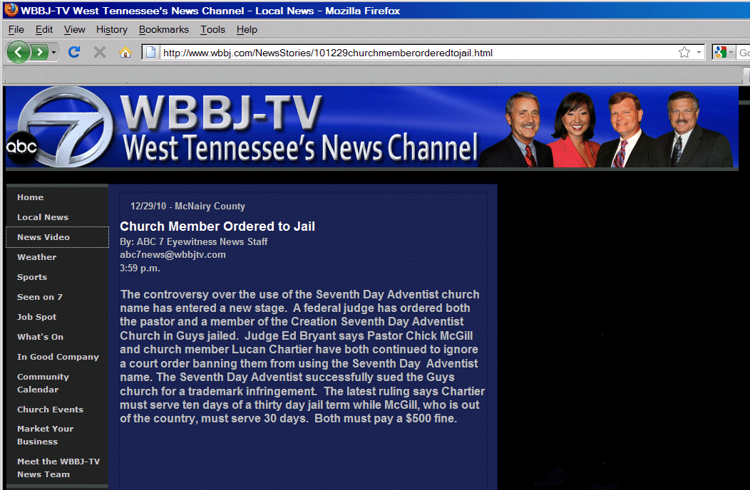 American Vision News - Loma Linda - WBBJ TV News In Print Pastor Jailed After Following "Vision", Conscience on Church Name