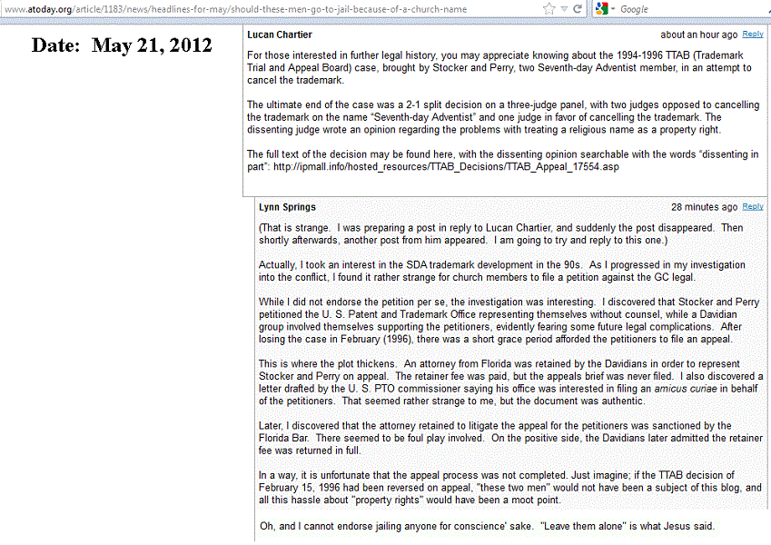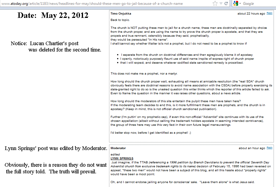 Any comments or questions are welcome. Post Pastor "Chick" at the official email address, sda_trademark_lawsuit@yahoo.com.