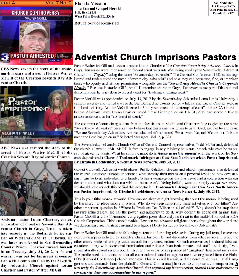 September, 2012 Eternal Gospel Herald Report: "Adventist Church Imprisons Pastors"