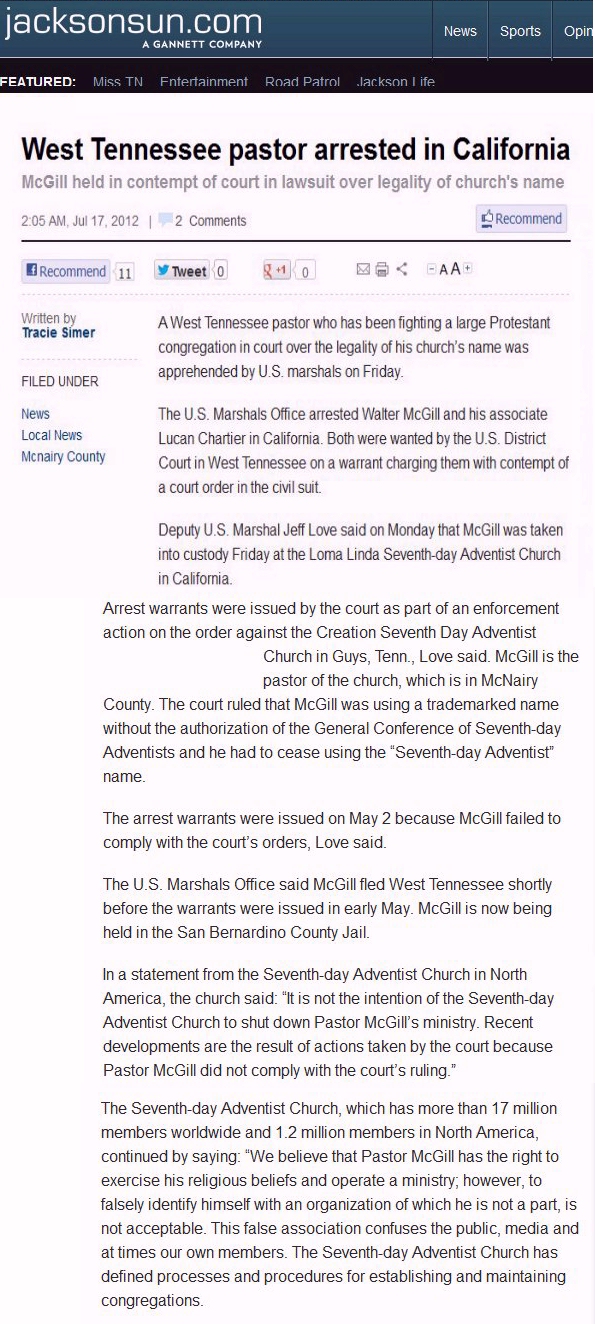 IgrejaAdventist.org Tennessee Pastor Arrested for Including 'Seventh-day Adventist' in Church Name