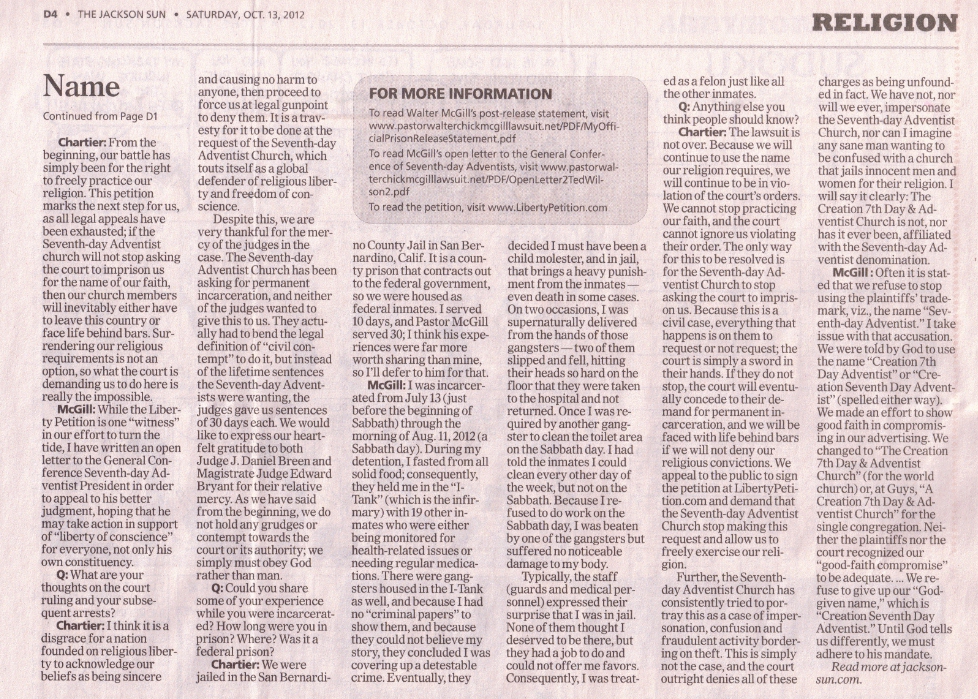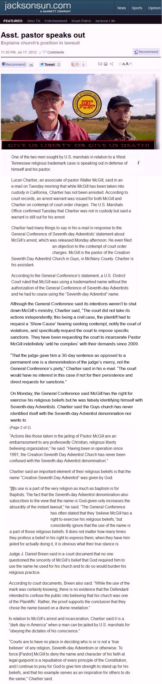 Pastor McGill and Lucan Chartier are to receive fines and jail time.November 9, 2010: Cert. Filed In Seventh Day Adventist Case: Does RFRA Apply To Suits Between Private Parties?