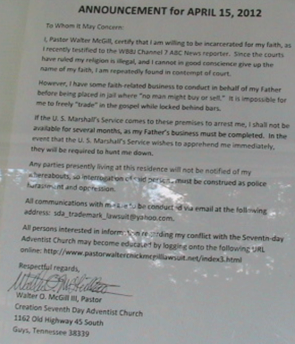 WALTER MCGILL and the Creation Seventh Day Adventist Church HOAX WEBSITE